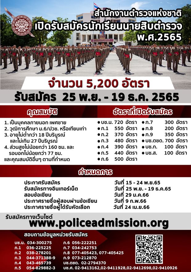 สำนักงานตำรวจแห่งชาติ เปิดรับสมัครบุคคลภายนอกฯ เพื่อบรรจุเป็นนักเรียนนายสิบตำรวจ พ.ศ.2565 จำนวน 5,200 อัตรา
