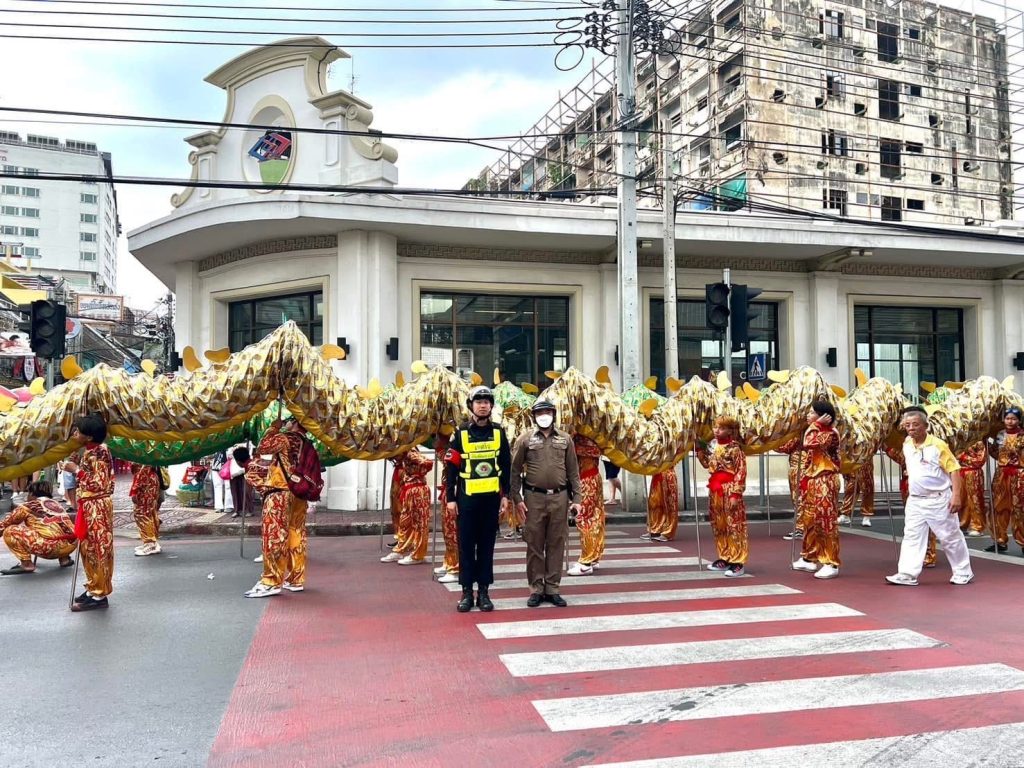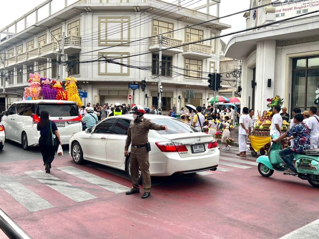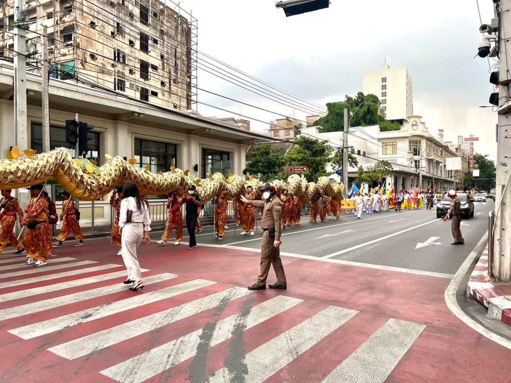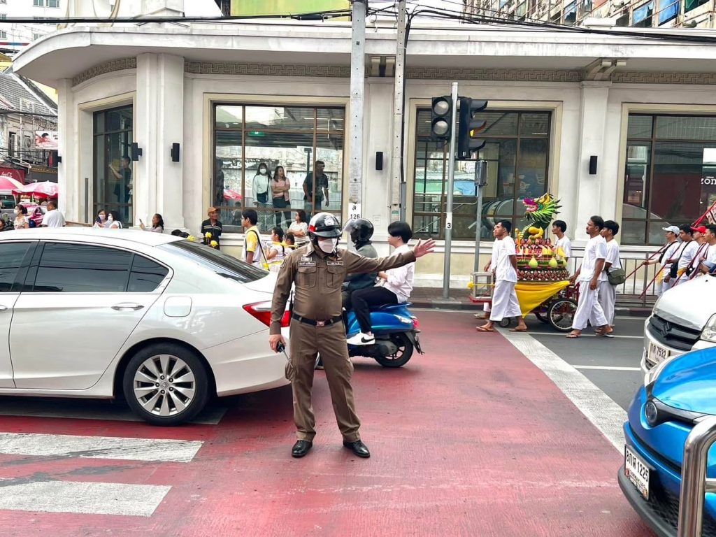 พร้อมกำลังฝ่าย จร. อำนวยความสะดวก ขบวนแห่เทศกาลกินเจ รถมากยังเคลื่อนตัวได้ ท้องฟ้ามืดครึ้ม ฝนยังไม่ตก.