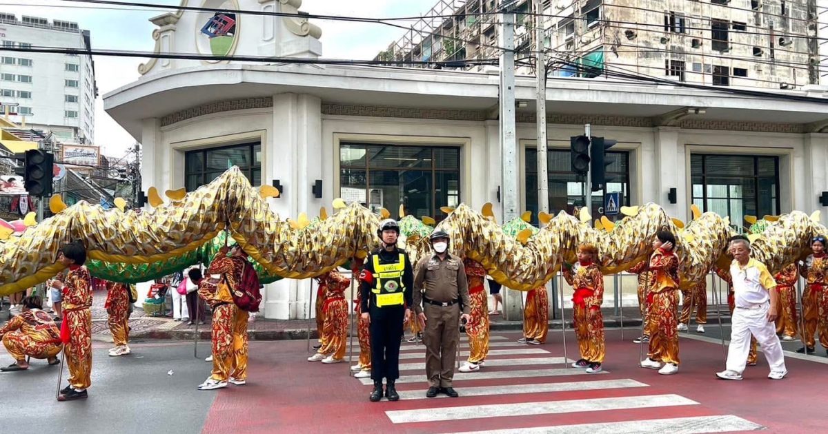 พร้อมกำลังฝ่าย จร. อำนวยความสะดวก ขบวนแห่เทศกาลกินเจ รถมากยังเคลื่อนตัวได้ ท้องฟ้ามืดครึ้ม ฝนยังไม่ตก.