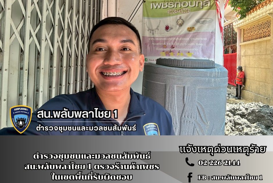 ตำรวจชุมชนและมวลชนสัมพันธ์ 21 เมษายน 2026 โดย plubplachai1 / ข่าวประชาสัมพันธ์,งานตำรวจชุมชนสัมพันธ์ 2569,ประจำเดือน เมษายน 69 ตชส. ตำรวจชุมชนและมวลชนสัมพันธ์ สน.พลับพลาไชย 1 ตรวจร้านค้าเพชร ในเขตพื้นที่รับผิดชอบ ณ ตรอกอิสรานุภาพ