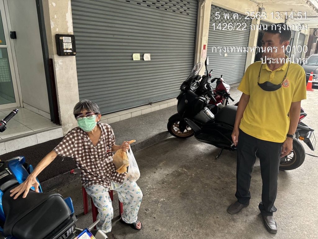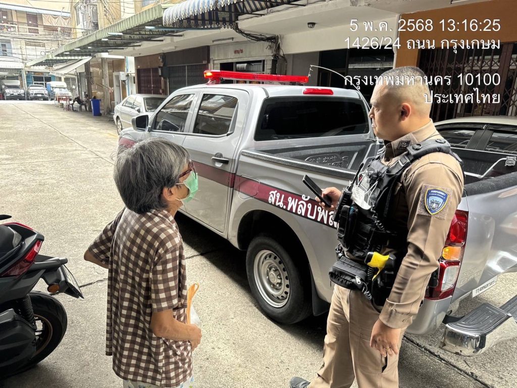 จึงได้เดินทางไปตรวจสอบ พบเป็นหญิงสูงวัย อายุประมาณ 70ปี สอบถามเบื้องต้นทราบว่ามีที่พักอยู่ใกล้5แยก พลับพลาไชย พลับพลา 2-0 จึงได้นำส่งที่พัก เรียบร้อย สอบถามบ้านข้างเคียงได้ความว่า หญิงดังกล่าวได้พักอาศัยอยู่บ้านหลังนี้จริง