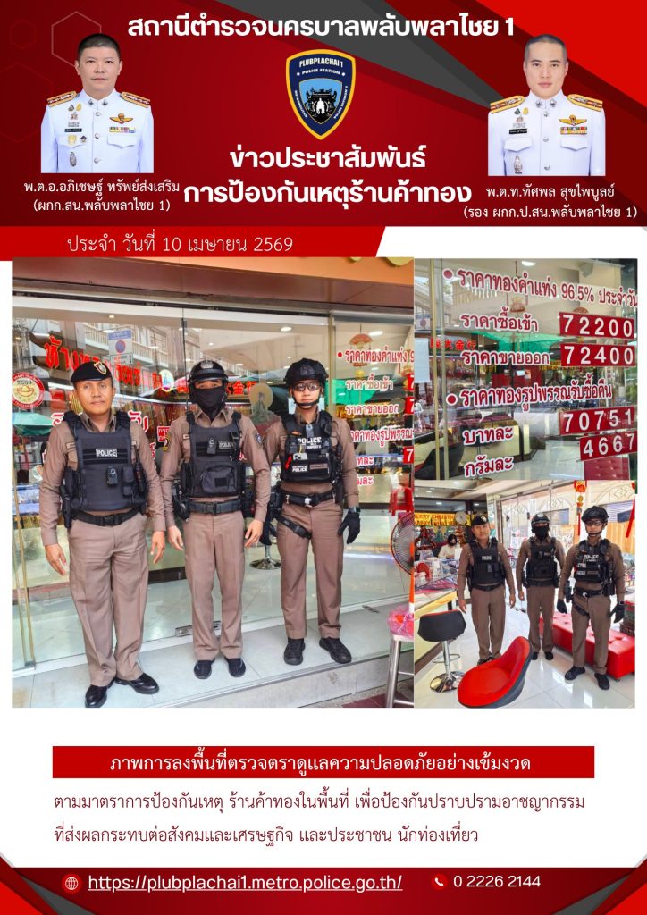 สายตรวจ ลงพื้นที่ตรวจตราดูแลความปลอดภัยอย่างเข้มงวด ตามมาตรการป้องกันเหตุ ธนาคารร้านค้าทองในพื้นที่ เพื่อป้องกันปราบปรามอาชญากรรมที่ส่งผลกระทบต่อสังคม เศรษฐกิจ และประชาชน นักท่องเที่ยว