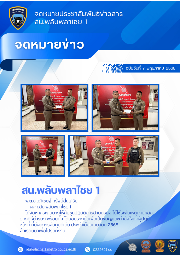 ได้จัดหากระสุนยางให้กับชุดปฏิบัติการสายตรวจ ไว้ใช้ระงับเหตุตามหลักยุทธวิธีตำรวจ พร้อมทั้ง ได้มอบรางวัลเพื่อเป็นขวัญและกำลังใจแก่ผู้ปฏิบัติหน้าที่ ที่มีผลการจับกุมดีเด่น ประจำเดือนเมษายน 2568 ดังนี้