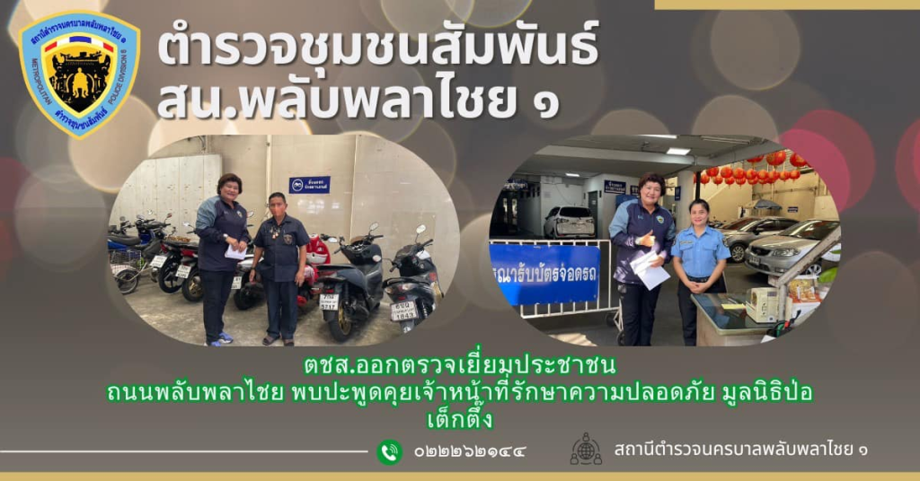ตชส. ออกตรวจเยี่ยมประชาชน ประชาสัมพันธ์ป้องกันอาชญากรรม พร้อมแจกแผ่นพับ เบอร์โทรศัพท์สายด่วนฉุกเฉิน คู่มือประชาชน แก่เจ้าหน้าที่รักษาความปลอดภัย และสร้างภาพลักษณ์ที่ดีของข้าราชการตำรวจ