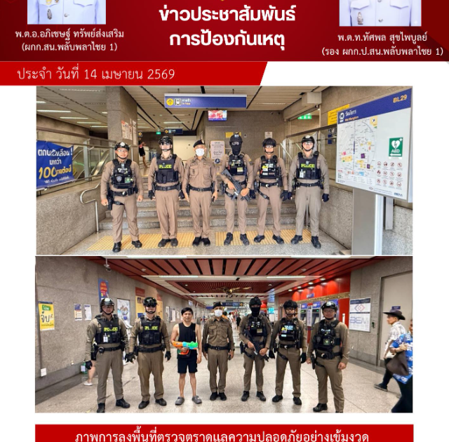 เจ้าหน้าที่สายตรวจ ชุด MPB SWAT สน.พลับพลาไชย 1 เดินเท้าป้องกันเหตุอาชญากรรม MRT วัดมังกร 21 เมษายน 2026 โดย plubplachai1 / ข่าวประชาสัมพันธ์,งานป้องกันปราบปราม 2569,ประจำเดือน เมษายน 69 ป.