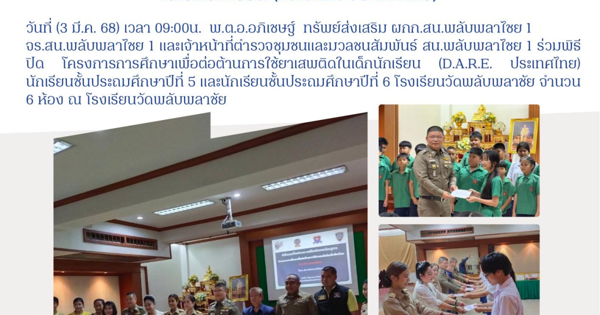 และเจ้าหน้าที่ตำรวจชุมชนและมวลชนสัมพันธ์ สน.พลับพลาไชย 1 ร่วมพิธีปิด โครงการการศึกษาเพื่อต่อต้านการใช้ยาเสพติดในเด็กนักเรียน (D.A.R.E. ประเทศไทย) นักเรียนชั้นประถมศึกษาปีที่ 5 และนักเรียนชั้นประถมศึกษาปีที่ 6 โรงเรียนวัดพลับพลาชัย จำนวน 6 ห้อง